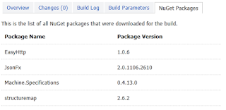 As you use NuGet Packages Installer in the build, you may want to know what exact versions of packages were used in the build. For this we provide a 'NuGet Packages' tab for every finished build.