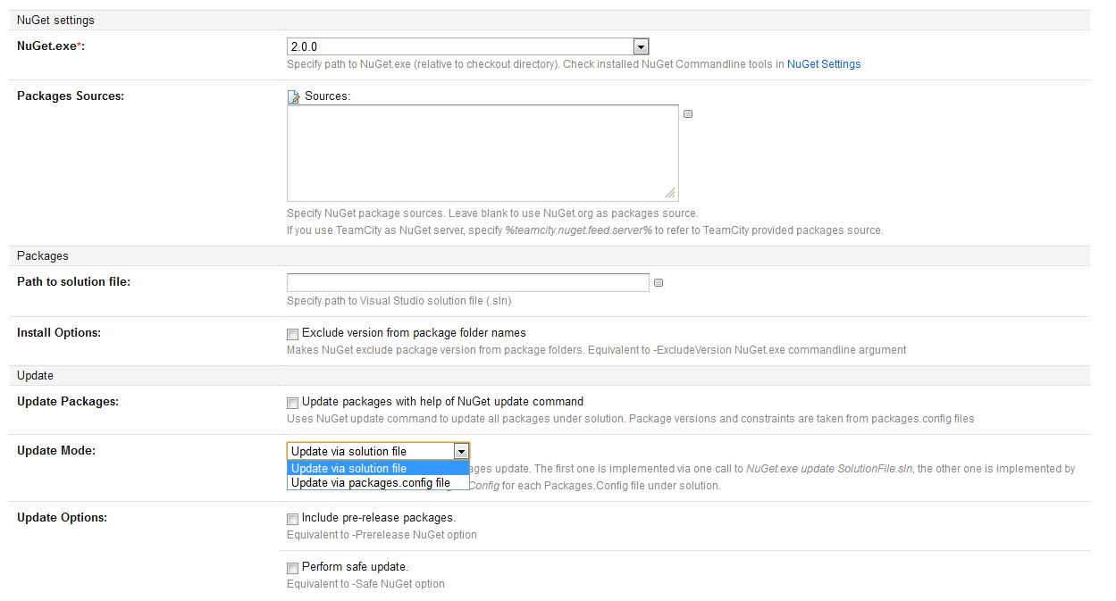 Remember, you have to select a version of NuGet from the list of all NuGet versions. It received may feedback messages form uses who tried to use it on the machine behind proxy or firewall. So I added an option in the dialog to upload a NuGet.CommandLine package into TeamCity in case you do not have an access to public NuGet feed or you like to use some custom build of NuGet.