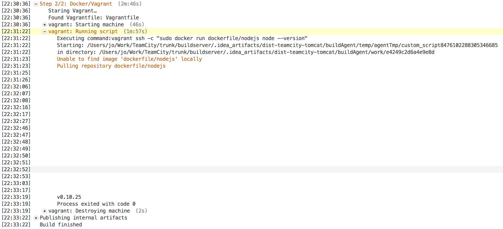 In the next posts I'll cover details on how to use TeamCity.Virtual plugin to run builds with Nodejs, JVM, Android and much more. Remember, all you need to configure for build agents is Docker or Vagrant. Here are links for publicly available images: Vagrant Boxes and Docker Images